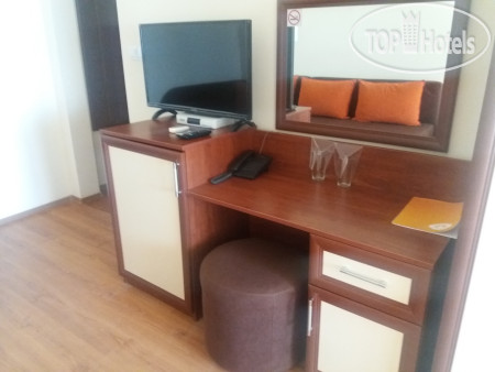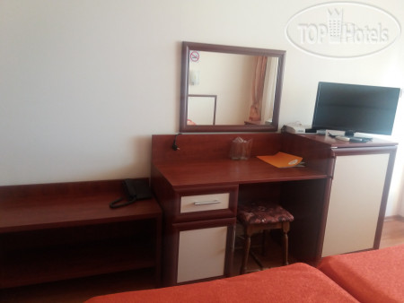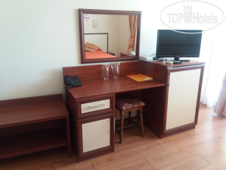 В номерах кроме кровати и прикроватных тумбочек есть большой шкаф для вещей, хватит даже для владельцев большого гардероба. Так есть шкаф-столик, в котором скрывается небольшой холодильник и ящички под мелочи. Вниманию девушек — в номере есть хороший фен для укладки. Это было для меня удивлением, потому что обычно во всех отелях я встречала только обычных крохотный стационарный фен в ванной. Также в номере есть современный телевизор. Но мы им ни разу за отдых не воспользовались, так как были более интересные занятия). На балконе все удобства: два стула и столик, две сушилки для вещей. На каждом этаже в свободном доступе есть гладильная доска и утюг, включай и пользуйся.