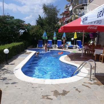 2 июля 2019 мы компанией из пяти человек приехали в этот отель. Нас радушно встретила хозяйка отеля Марьяна. В течение пяти минут нас разместили в два номера: №12 на втором и №35 на третьем этажах. В номерах чисто, уютно, прекрасный вид из окна на море и горы. Есть балкон, на котором так приятно было посидеть и насладиться моментом! На балконе есть столик и стулья. В номере был холодильник, телевизор, фен, гель для душа, мыло и по два полотенца для каждого. Белоснежное постельное бельё, которое меняли раз в три дня. Уборка производилась очень тщательно и каждый день. Отель небольшой, и от этого чувствовалось домашняя атмосфера, которую поддерживали хозяева своим доброжелательным отношением к постояльцам. Возле отеля небольшой бассейн, в котором с удовольствием купался наш малыш Рома. Территория отеля небольшая, но утопает в цветах, ароматом которых мы наслаждались каждый день. До моря неспеша 5-7 мин со спуском. Городской пляж чистый, песчаный. Зонты и лежаки платные. Вход в море плавный, песчаный. Водичка 25 градусов. Супер! Брали путёвку с завтраками. Завтраки- "шведский стол": омлет, каши, пицца, горячие бутерброды, мясная нарезка, сыры, мюсли, хлопья, выпечка, молоко, соки ,чай, кофе (кофемашина). Из фруктов: арбуз, дыня, персики, абрикосы, яблоки, груши. Выбора было много. Да к тому же всё очень вкусно! Обедали и ужинали за оплату в этом же ресторане. Большой выбор блюд, большие порции и приемлемые цены. И оооочень вкусно! Вечером есть где погулять и даже сходить на концерт в Амфитеатр на концерт известных российских звёзд. В общем от отдыха в этом отеле остались в полном восторге! Спасибо хозяевам этого замечательного отеля "Южные ночи" Христо и Марьяне, что сделали наш отдых незабываемым! Обязательно сюда ещё вернёмся! Ирина, Лариса, Инна, Сергей и маленький Рома.