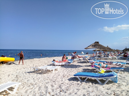 Летали под закрытие сезона библио глобус. Что туда что обратно переносили рейсы. На три часа и больше. Ехать от аэропорта около часа( отель последний в очереди трансфера). Поставила 5 за размещение, так как приехали рано утром(ночной перелёт) заселила сразу в номера с видом на море,хотя брали стандарт без оплаты вида. Номера хорошие, всё есть и работает. Муравьёв нет, медуз в море рядом нет, только далеко в море видели, когда на парашюте летали. Водоросли есть, но пляж чистят. Почему бы посоветовала этот отель если летите в Тунис впервые и Вас привлекает цена. Важно- впервые!!! Ибо одного раза более чем достаточно. Даже если Вы возьмёте пятёрку это не значит что Вас будут кормить на уровне этой пятёрки. Питание это большой минус этому отелю и стране в целом. Разбавленный апельсиновый сок на завтраке!!! Разбавленный не водой, а их юппи химическим. Детский стол отсутсвует ( хотя он есть , но конец сезона и они максимально свернулись). Кофе помои. Алкоголь ниже 3 звёзд. Ели в основном картошку( она реально вкусная) курицу, мороженное. Десерты однотипные, на любителя. Овощи сухие и ватные. То есть ты ходишь и думаешь чем бы удалить голод, а не чего вкусного съесть!!! Ну и вонючая печёнка( реально пахнет на весь отель) в наличии. Два раза за 2 недели были креветки и мидии. Фрукты: деревянные несъедобные груши, безвкусный арбуз, подгнивший виноград,неспелая дыня( хотя иногда была и вкусная) яблоки средние, очень вкусная слива и персики( их давали по три дня в неделю))) один раз были на обед кактусы. В общем питание главный минус. Из-за конца сезона все уличные бары и кафе закрыты . На территории негде поесть. Открывают микро поздний завтрак с 10-11 ( булки, масло, йогурт, фруктов пару штук) около пляже. А в 15.00-17.00 пекут блинчики и мороженое . Но и то не всегда. Был дождь и они перевозят всё в помещение. Мы не знали и остались без питания на это время. Отдельная песня про официантов!!!!
